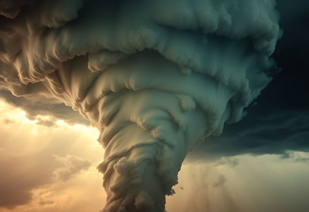 A captivating scene shows a dramatic tornado twisting over golden fields as dark clouds loom above, creating an intense and breathtaking atmosphere at dusk.