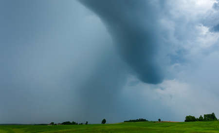 A very large storm, possibly a tornado, is seen moving rapidly across the sky. Dark clouds loom menacingly as the storm gathers strength and intensity, indicating imminent severe weather conditions.