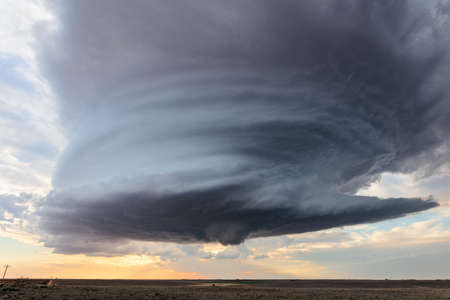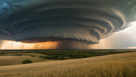 This stunning image captures the awe-inspiring beauty of a supercell thunderstorm with a swirling vortex, showcasing intense weather dynamics and a dramatic sunset backdrop.