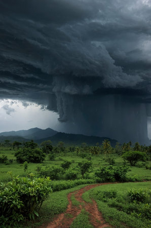 A vast dark storm cloud looms over a vibrant green landscape, with a visible dirt road in the foreground; This striking scene is perfect for travel and weather-related projects.