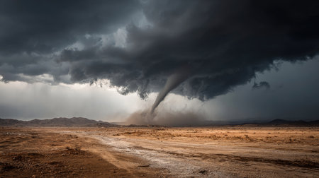 A stunning view of a tornado forming amidst dark storm clouds over a dry landscape, capturing the raw power and beauty of nature's most dramatic phenomena.