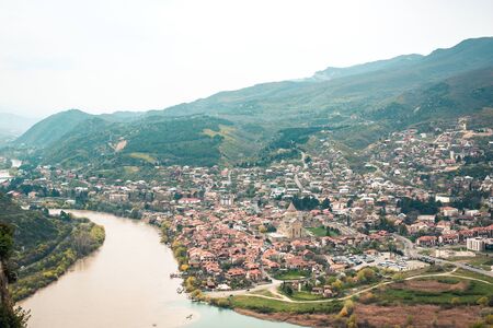 Panoramic beautiful view of Mtskheta with the rivers Kura and Aragvi, Svetitskhoveli Cathedral and castle complex in Mtskheta, Georgia.