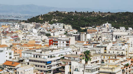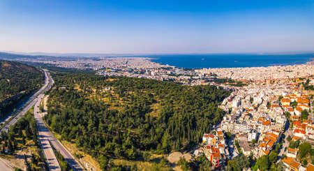 Drone aerial view of port city - Thessaloniki - showing cluttered white houses with orange rooftop. Sunny weather. Summer voyage concept. High quality photo