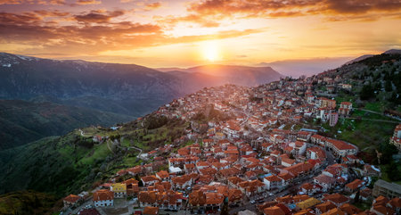 Aerial view of the popular mountain village Arachova, Boiotia, Greece, tourist resort for ski and trekking sports during a golden winter sunset