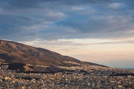 Sunset over Athens, Greece. Aerial drone panoramic view from Penteli mount. Last sunbeams over Greek capital city. Destination Athens, where sunrays caress, heat up people and hearts, banner.
