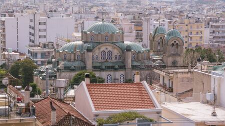 Athens, Greece - September 23, 2015. View of the capital of Greece Athens from the port. In the foreground with a typical greek church.