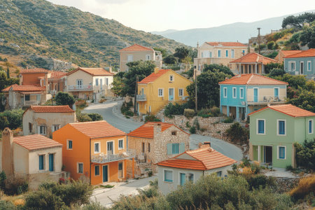 Traditional Greek village with colorful houses and red tiled roofs is nestled on a hillside on a sunny day