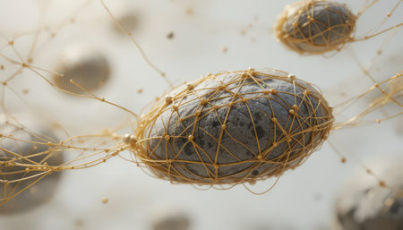 This image features numerous spherical structures with a distinct textured surface. The primary focus is on a prominent sphere, while others are partially visible in the background, creating depth. The composition utilizes a blurred effect, likely in a dark environment with blue and yellow hues. Suitable for scientific, educational, and abstract design purposes.