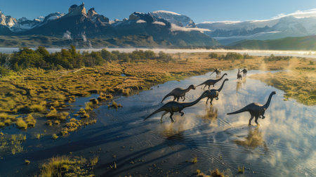 A tranquil herd of dinosaurs walks through the Patagonian wetlands, with soft mist rising over the water as dawn breaks, creating a serene atmosphere.