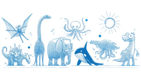 A charming collection of blue cartoon-style animals and mythical creatures arranged in a playful line, including a dinosaur, elephant, octopus, and more.