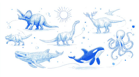 A charming watercolor illustration featuring a variety of dinosaurs and sea creatures in shades of blue.