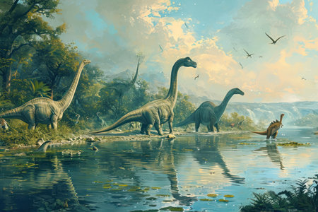 Graceful Brachiosaurus dinosaurs at tranquil lakeside, reflecting in water amidst a Jurassic forest