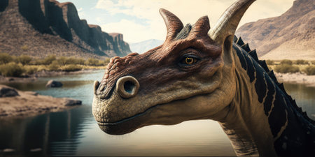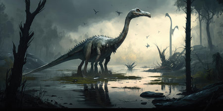 Prehistoric creature or dinosaur in the wild nature. Realistic style drawing. superlative generative AI image.