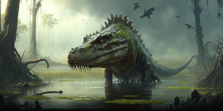 scary big dinosaur in the forest. Generative Ai