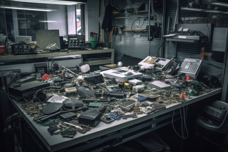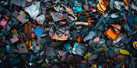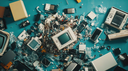 A colorful and chaotic overhead view of a pile of vintage electronics and accessories surrounded by plastic and waste materials. This image highlights the challenges of e-waste recycling and environmental impact.