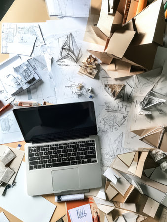 A laptop sits on a cluttered table surrounded by architectural sketches, paper models, and scattered design materials during a creative session.
