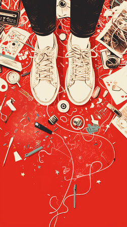 Artistic top-view photo of sneakers amidst an array of creative tools on a bright red surface, symbolizing creativity and inspiration in a dynamic workspace. Ideal for themes of design, art, and innovation.
