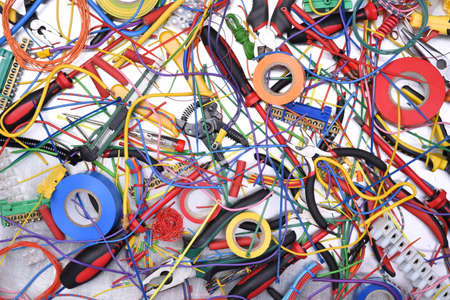 Technology chaos electric tool component and cable above view