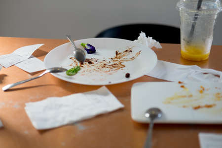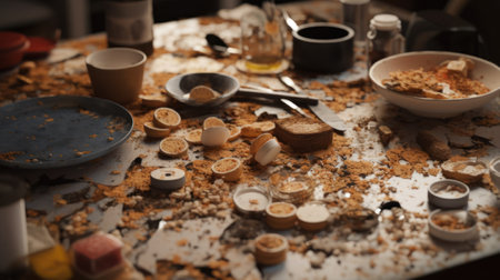 dirty table with dirty dishes in kitchen generative ai.