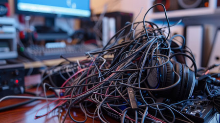Headphones lying under pile of tangled audio cables