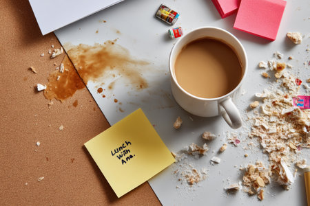 Coffee cup surrounded by sticky notes and crumbs shows a busy workspace during lunchtime.