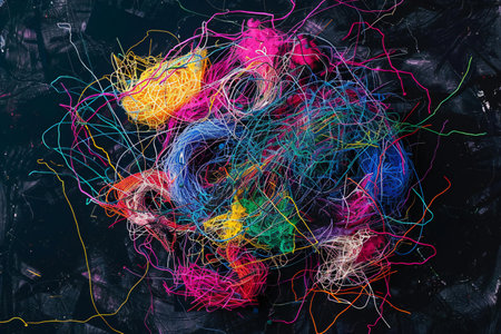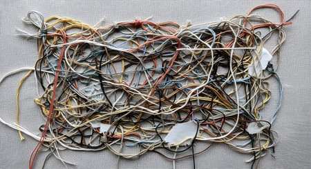 A chaotic and tangled mess of colorful embroidery threads is spread across a neutral fabric background. This abstract image represents complexity, confusion, chaos, problems, or the messy backside of a creative project.