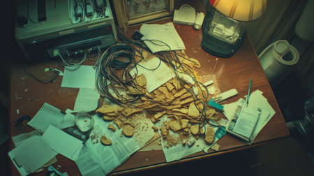 A chaotic office scene with a cluttered desk covered in crumbs, tangled cables, and scattered papers. The warm lamp light contrasts the disarray, highlighting the everyday mess of a busy workspace.