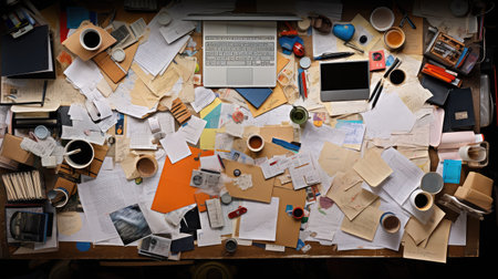Concept of Uninspired Workspace: An office desk cluttered with disorganized papers and empty coffee cups, representing a lack of motivation. High angle shot, showcasing the chaos.