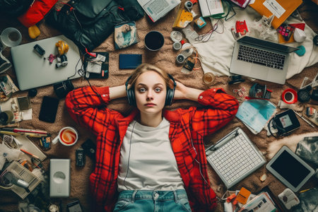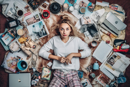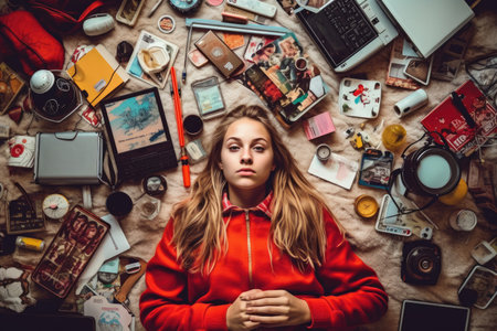 A top view of a Scandinavian teenage female lying on the floor with many electronic devices. Generative AI AIG30.