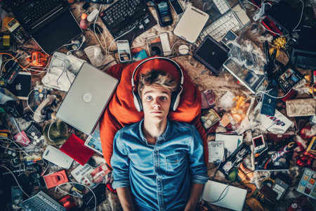 A top view of a Scandinavian teenage male lying on the floor with many electronic devices. Generative AI AIG30.