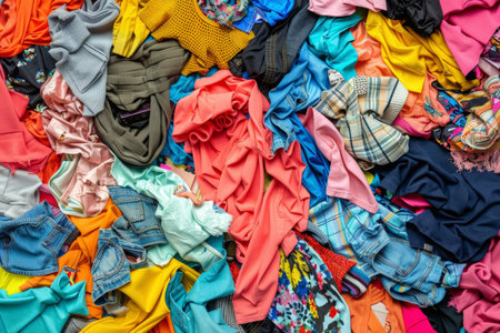 Pile of various colorful clothes, fast fashion waste concept. Mixed garments heap for textile recycling design