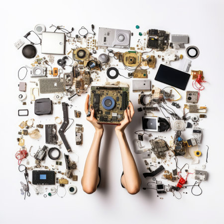 Disassembled electronic devices in the hands of a woman on a white background Aerial view of hands with computer electronics parts on a white background --v 5.2 Job ID: bd2430c4-835e-4a83-8ed6-9880918e2add