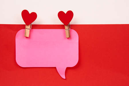 Note And wooden clothespins red heart Valentines day and red sheet of paper isolated background
