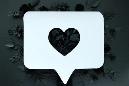 Black paper flowers, floral background, bridal bouquet, wedding, quilling, Valentine's day greeting card, heart shape on white background. Gothic