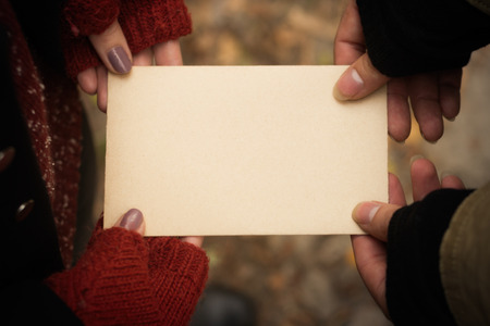 Couple holding an empty vintage sheet of paper in their hands. Copy space.