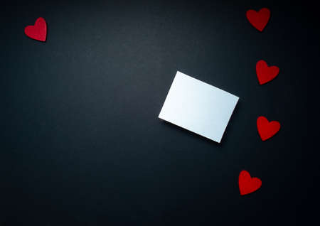 romantic valentine mock up with white note or card on black background with red hearts for your message, copy space