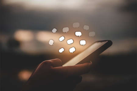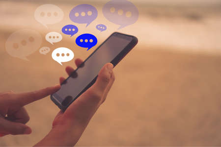 Woman hand using smartphone with chat icon background. Business communication social network concept.