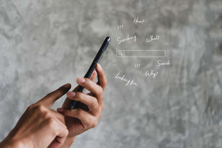 People hand using mobile phone or smartphone searching for information in internet online society web with search box icon and copyspace.