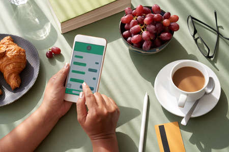 Close-up shot of unrecognizable woman sitting at kitchen table and texting with friend on smartphone while having breakfast