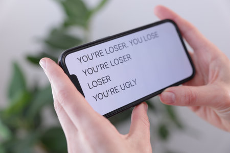 Cyber bullying. Woman holding smartphone with insults on blurred background, closeup
