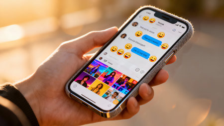 Close-up image of woman holding smartphone with social media app on screen