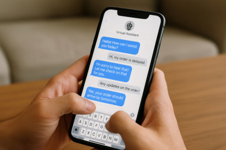 Close up of hands using smartphone to communicate with virtual assistant regarding delayed order, showcasing modern customer service