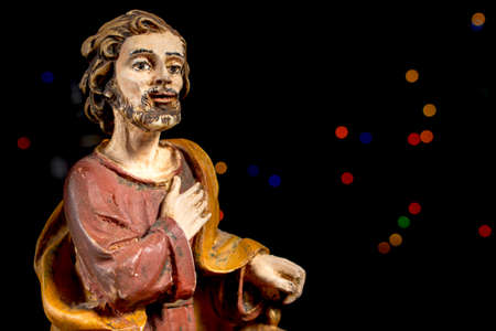 Saint Joseph with colorful stars at background. Nativity scene figures. Christmas traditions.