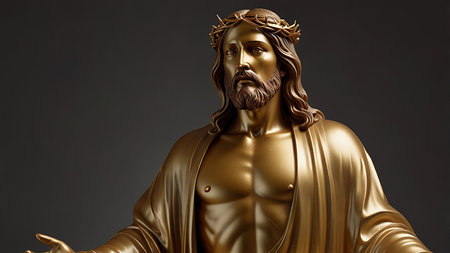 Jesus Christ with Crown of Thorns Black Gold Statue. Copy Space Banner 3D Rendering