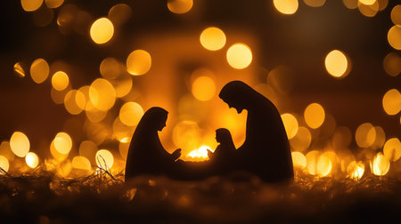 A beautifully captured silhouette of a nativity scene against a backdrop of warm bokeh lights, evoking the spirit and tranquility of the Christmas season and family gatherings.
