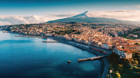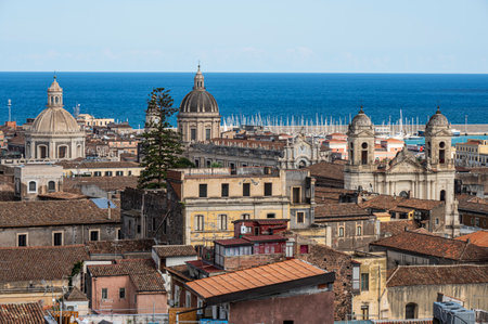 Catania, Italy - 09-23-2022: Aerial panorama of Catania with the port in the background