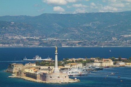 Messina, Sicily, Italy - October 7, 2017: View of the Messina's port with the gold Madonna della Lettera statue in Sicily, Italy.