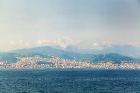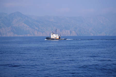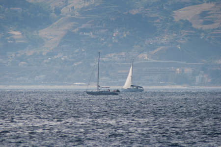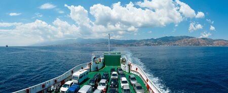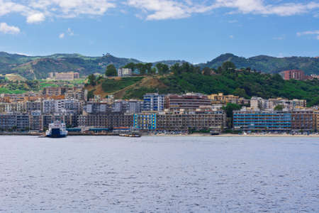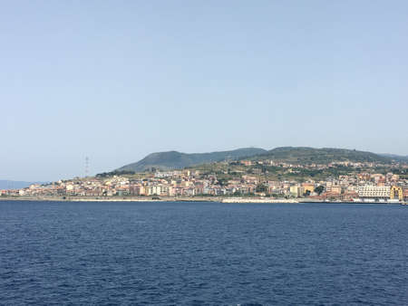 MESSINA, ITALY - JUNE 18, 2017: View of the Messina sea strait and coastline from the side of the ferry to Sicily island, Italy