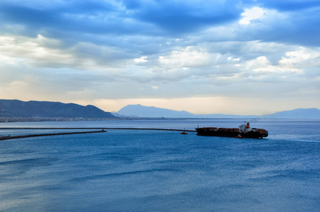 Beautiful panorama of Messina port with blue mountains in the background. It is written on the seawall in Latin