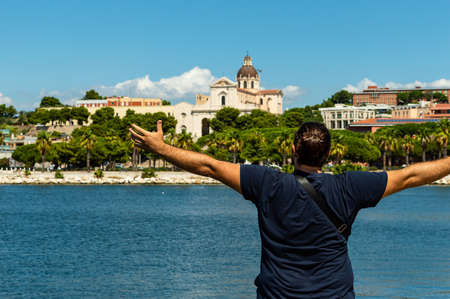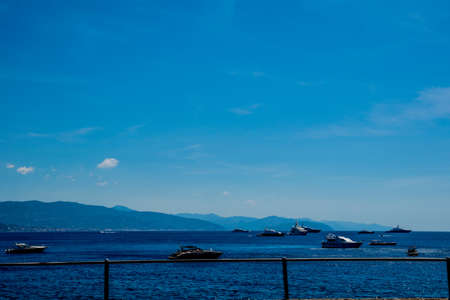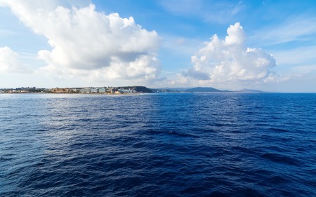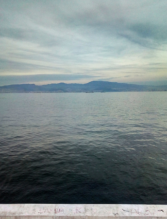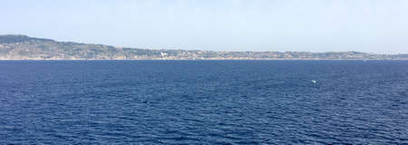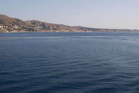 The Strait of Messina connected Mediterranean and Tyrrhenian sea and Sicilia island with blue sky and coast as background, view from promenade quay waterfront of Reggio di Calabria, Southern Italy